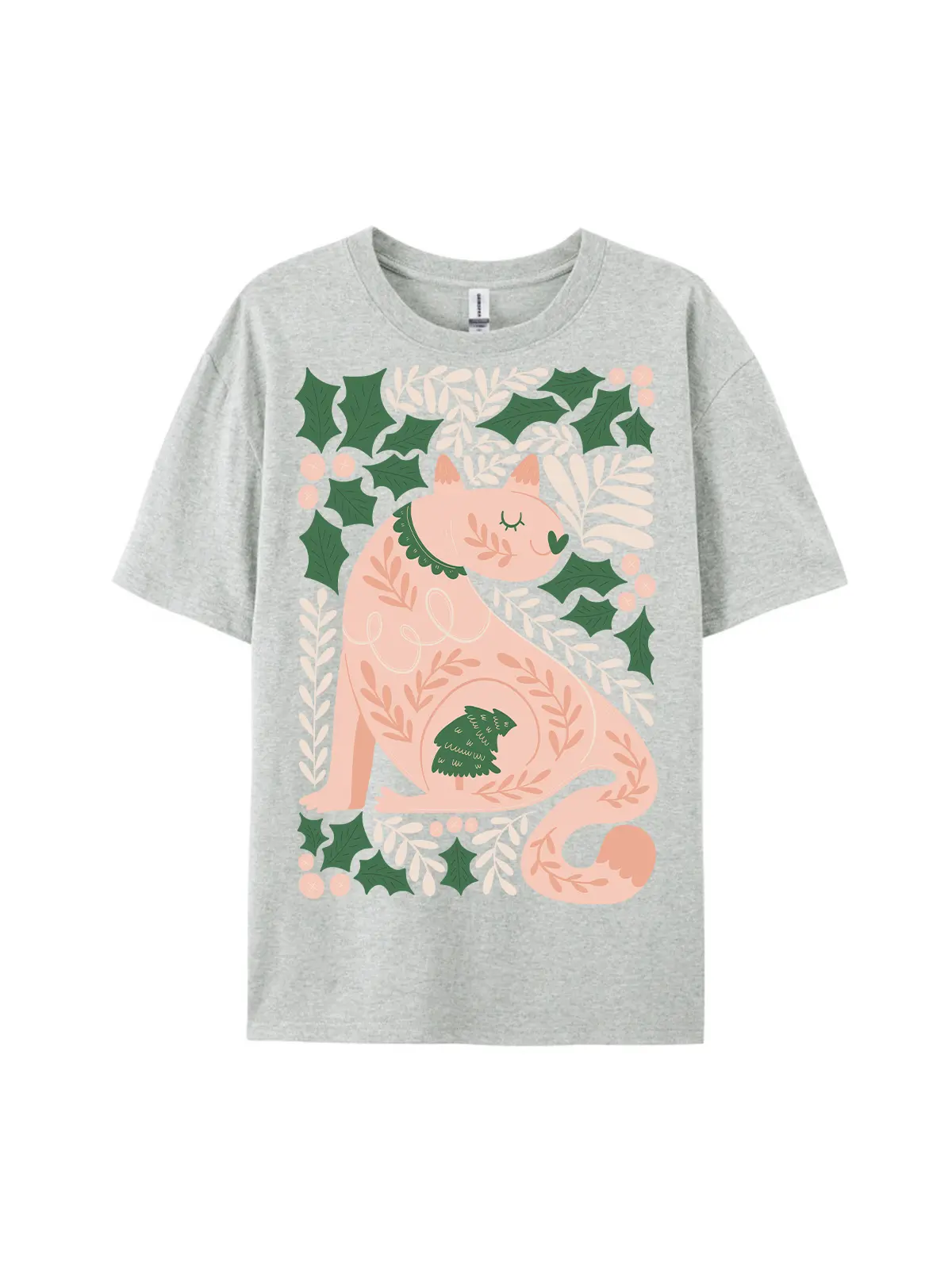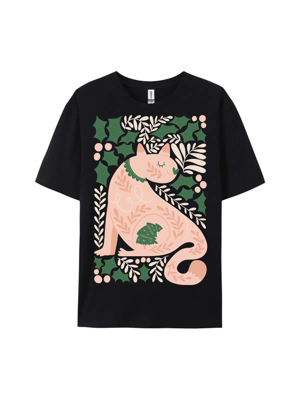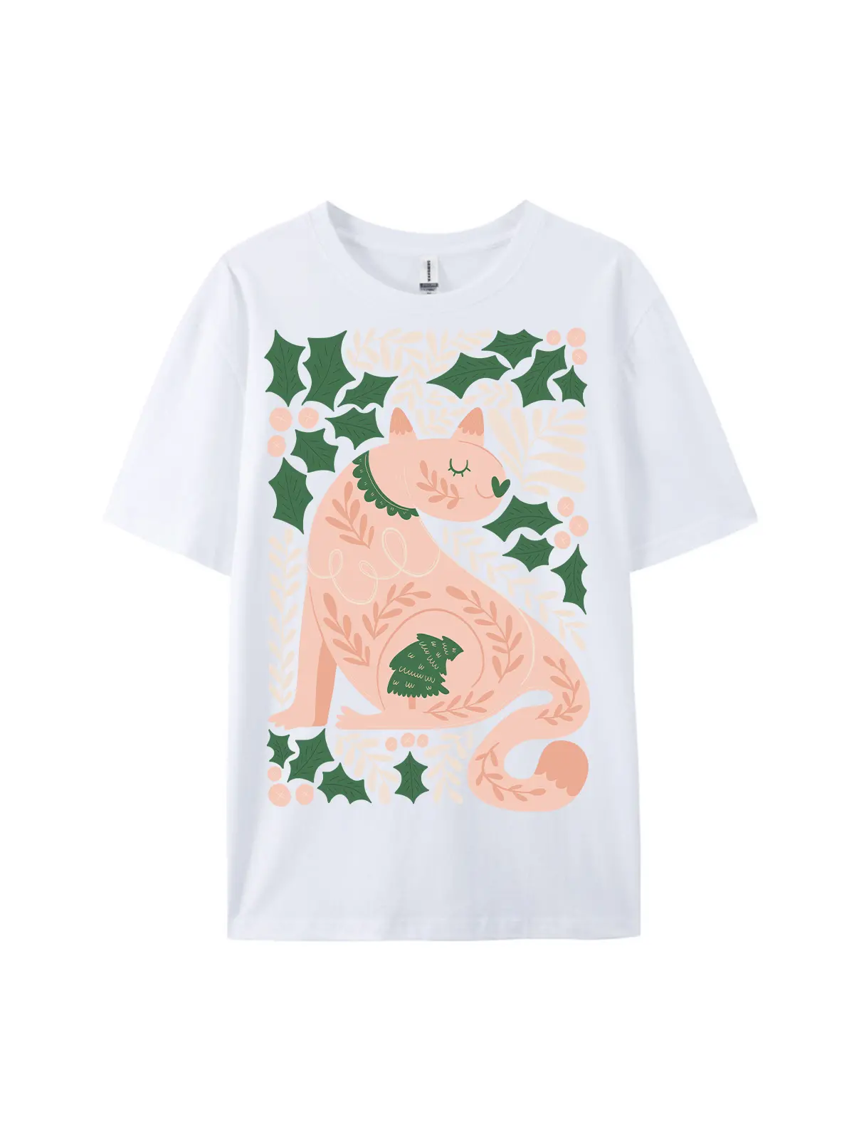 Christmas Cat & Holly Graphic Tee For Women MenChristmas Cat & Holly Graphic Tee For Women Men