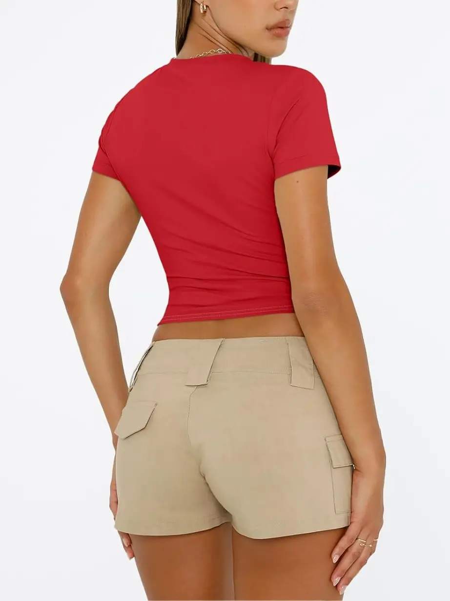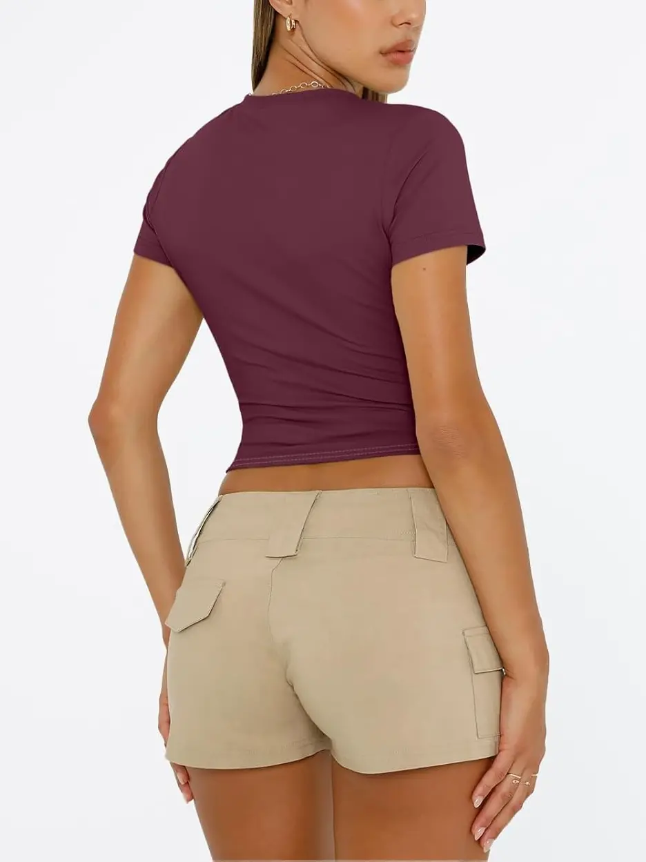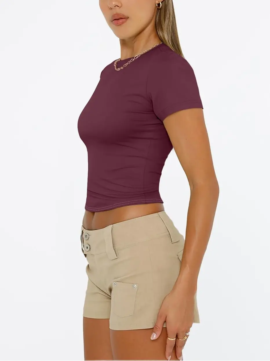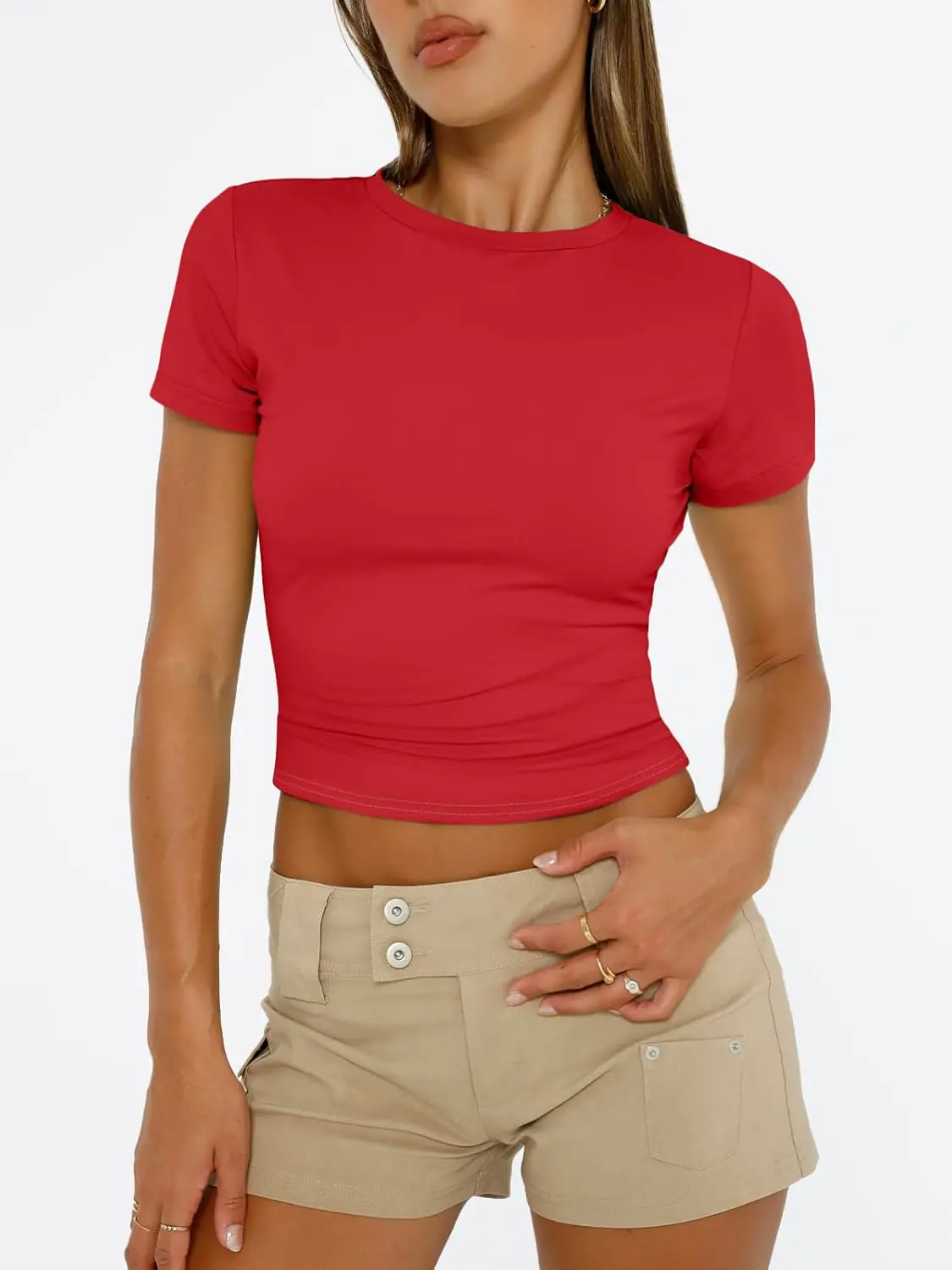 - Design: This top features a cute, slim-fitted, and casual style with a crew neck and short sleeves. It comes in both cropped and regular styles, giving you the option to wear it as a regular top or fold it up for a trendy crop top look.